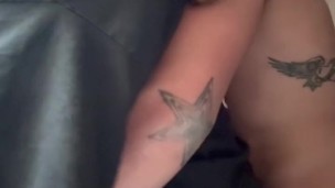 Deepthroats and gets fucked by tattooed guy, watch him cum on my pussy